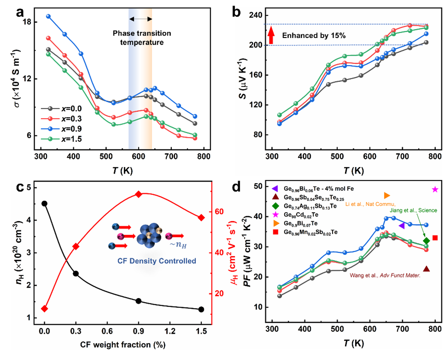 图二:不同碳纤维掺杂浓度下的GeTe基材热电材料电输运性质