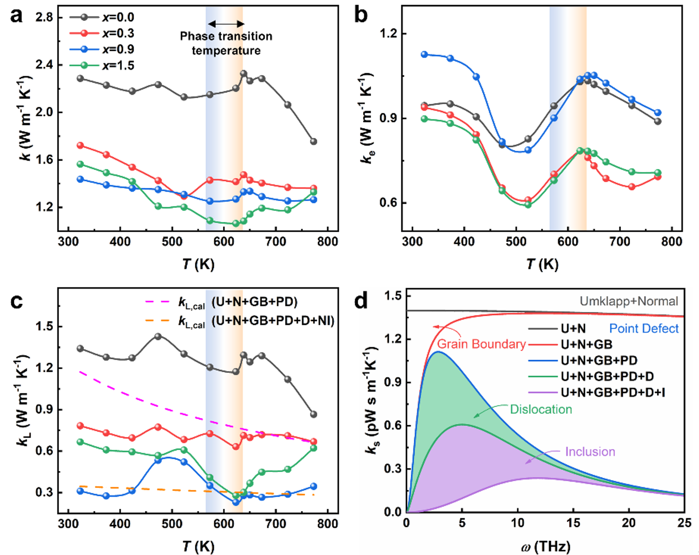 碳纤维的掺杂除了能通过能量过滤效应提高材料电输运性质外,还可以进一步通过增加GeTe基热电材料的高维缺陷,如晶界、位错、层错等,增强对低频与中频的声子散射,从而降低晶格热导率(图三)。在0.9 wt%碳纤维的掺杂下,其晶格热导率显著降低,最低约为0.3Wm-1k-1。通过Debye-Callaway模型也进一步验证了晶界、位错、层错等高维缺陷对晶格热导率的影响。本研究通过对能量过滤效应与缺陷演化工程的协同调控,显著提高GeTe基热电材料的性能,同时给未来其他热电材料系统的性能优化提供了思路。