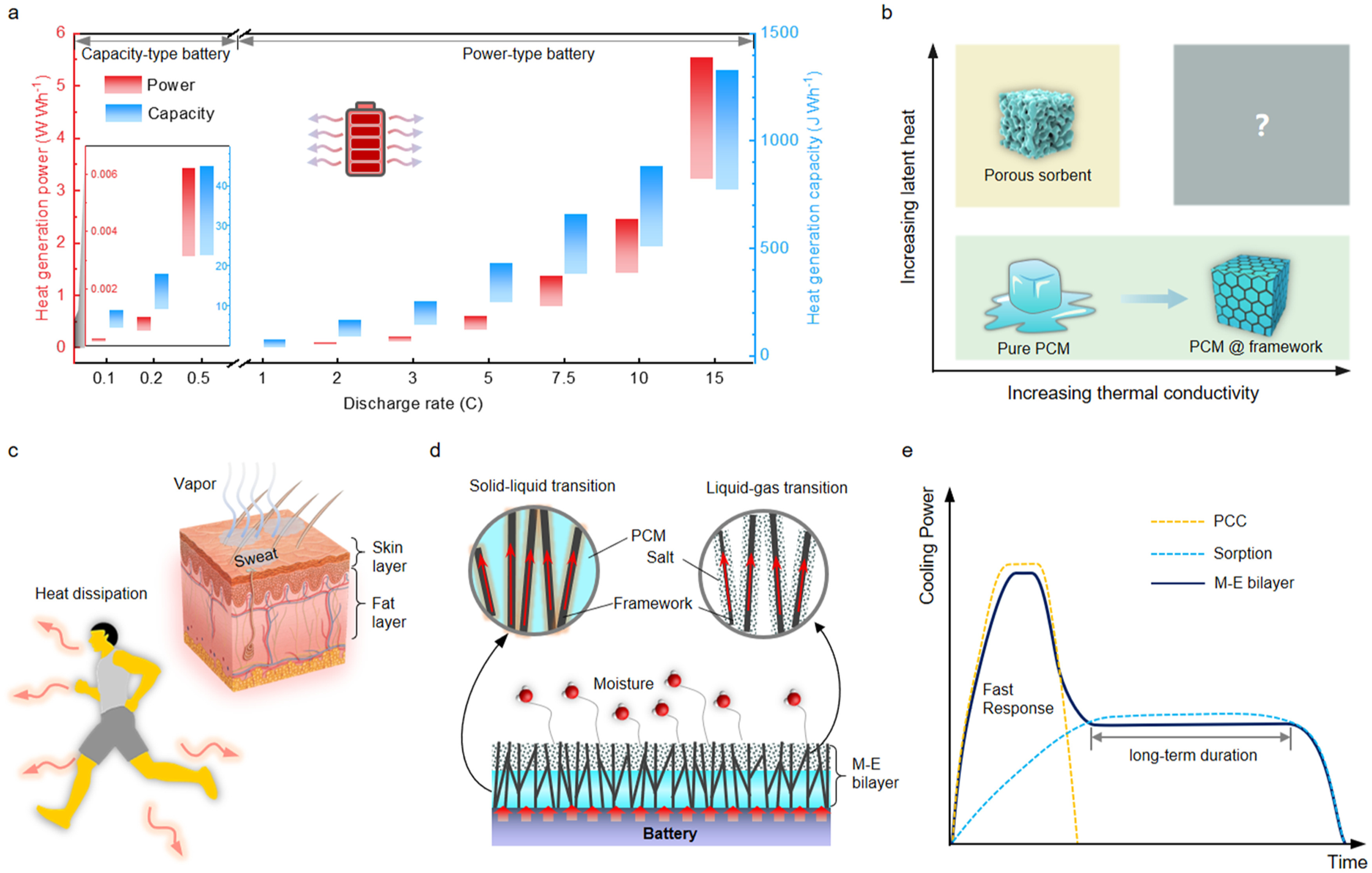 交通领域的电气化进程加速与规模储能的迅猛发展对电池的安全性与循环寿命提出了更高的要求。热管理技术是维持电池安全、高效工作的关键技术之一。随着电池容量与倍率性能不断提升以及应用场景的拓展,电池热管理技术正面临着新的挑战,尤其在电网调频、电动垂直起降飞机等新场景下,瞬态的高充放电功率不可避免地引起电池温度的快速上升。目前,利用固液相变、液气相变和固气吸附过程伴随的吸放热效应进行被动式电池热管理受到广泛关注,相变材料或者吸湿性材料作为热缓冲器可有效平抑散热功率、降低峰值热负荷,具有能耗低、结构简单等优点。然而,要想实现高效的被动式热管理,所用控温介质需满足两个条件:1)高导热性,以获得对瞬时高功率产热的快速热响应;2)高焓变,以延长有效控温时间。以石蜡类材料为代表的固液相变材料虽然可以通过引入高导热添加剂大幅提升其导热性能,但受限于材料相变焓通常低于200kJ/kg;以吸湿性材料MOF为代表的吸附工质对尽管具有较高的吸附焓变,但水蒸气传输通道的存在,导致其有效热导率通常低于1W/(m·K),且难以大幅度提升。