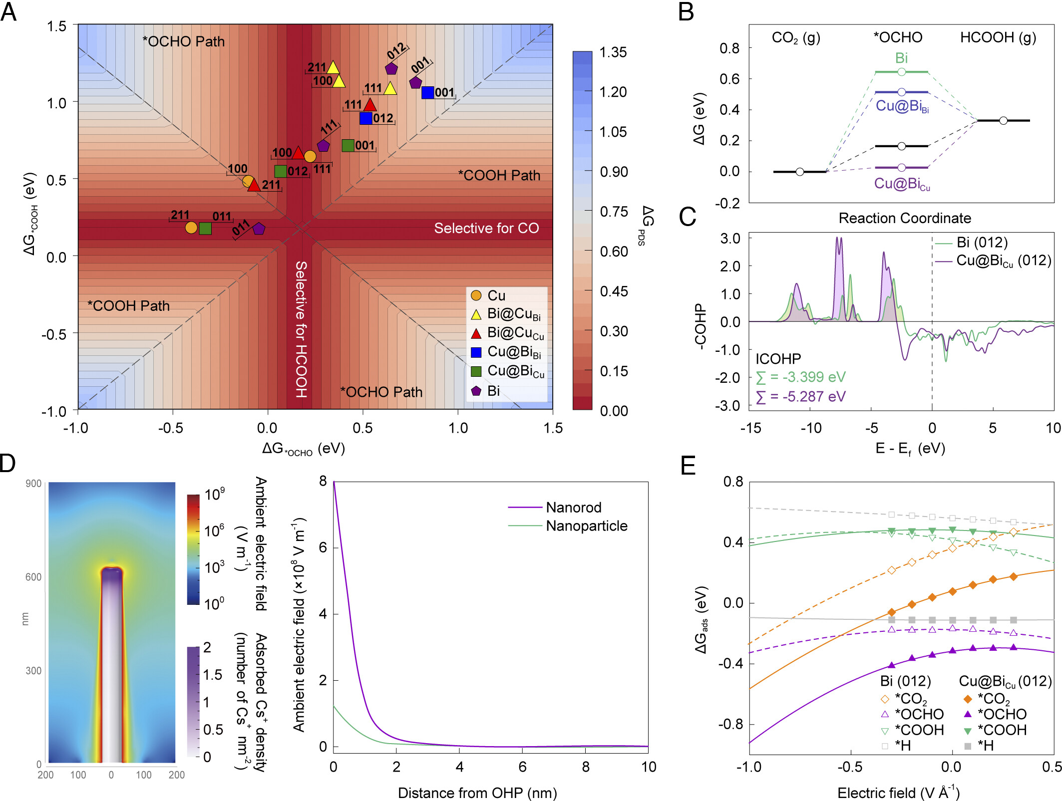 对此,蒋昆团队基于多尺度优化的Cu-Bi纳米棒阵列阴极结构,在固态电解槽中实现了常温常压下高效的HCOOH精准电合成,暨原子尺度上由Cu-Bi合金化作用来调节CO2还原中的甲酸根路径和一氧化碳路径,在介观尺度上通过尖端诱导的局部场强作用来稳定具有大偶极矩的*OCHO中间体,进而在器件规模上稳定生成>99.8%超高纯度的HCOOH溶液。在催化材料设计上,以铜铋氧三元纳米棒阵列为催化剂前驱体,通过电化学原位X射线衍射谱和计算Pourbaix图追踪了Cu-Bi纳米棒阵列的生成过程;在反应机制上,通过二维反应相图、有限元分析和晶体轨道哈密顿布局分析揭示了Cu在Bi金属表面的掺杂作用和局部场强作用对于η2(O,O)-OCHO关键中间体吸附能及相关反应路径的关键调控机制;在200小时的连续器件测试中,最终实现了CO2到HCOOH精准电合成过程39.2%的能量转化效率。
