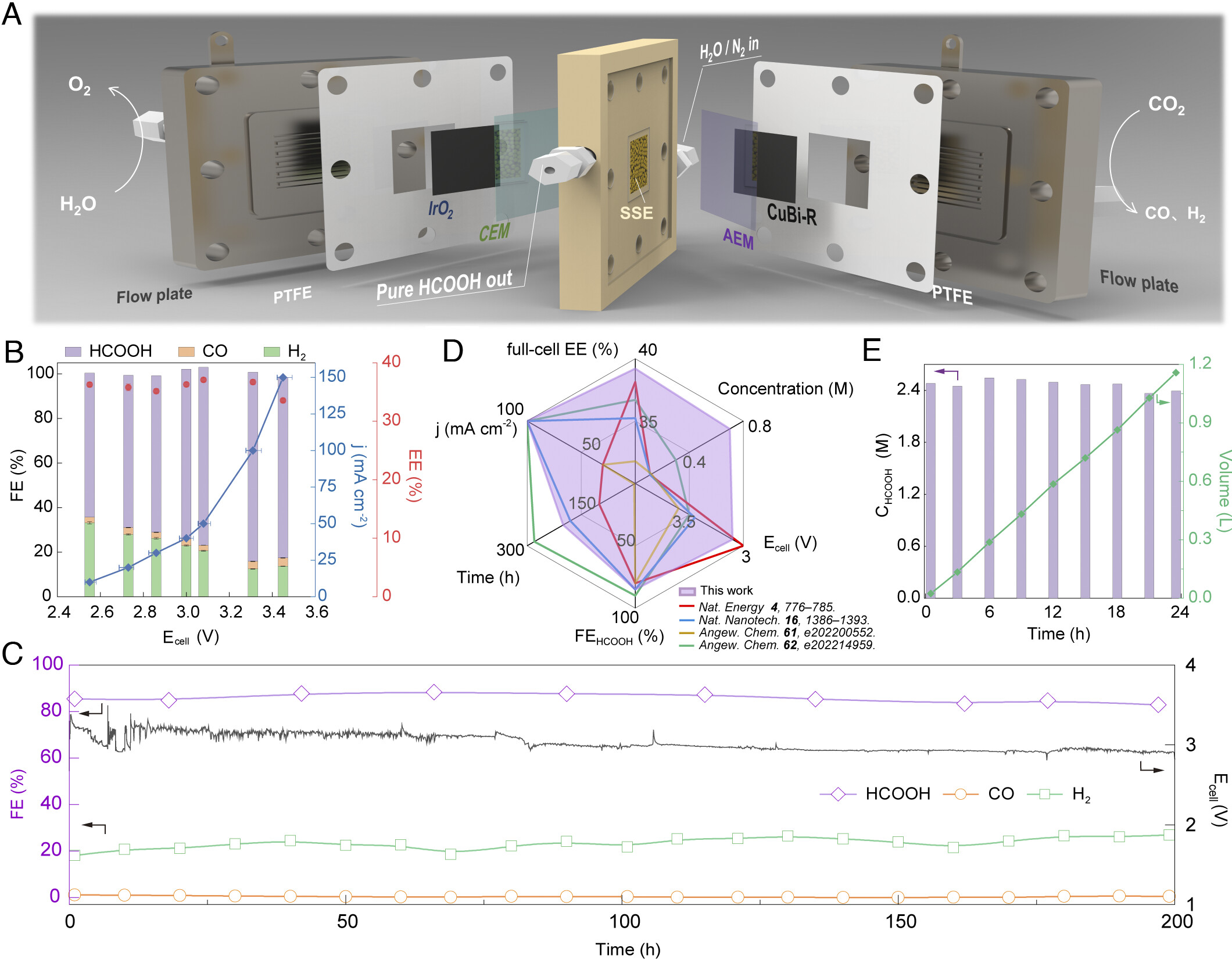 利用可再生能源将二氧化碳电化学转化为高附加值化学品和液体燃料是一种极具潜力的构筑碳中性能量与物质循环的方法。在所有电合成化学品中,甲酸(HCOOH)产物兼具最佳的热值和经济可行性,但CO2到HCOOH的增值转化过程在很大程度上受限于高过电位带来的低能量转化效率,以及产物从电解质盐中分离的高能耗下游工艺。