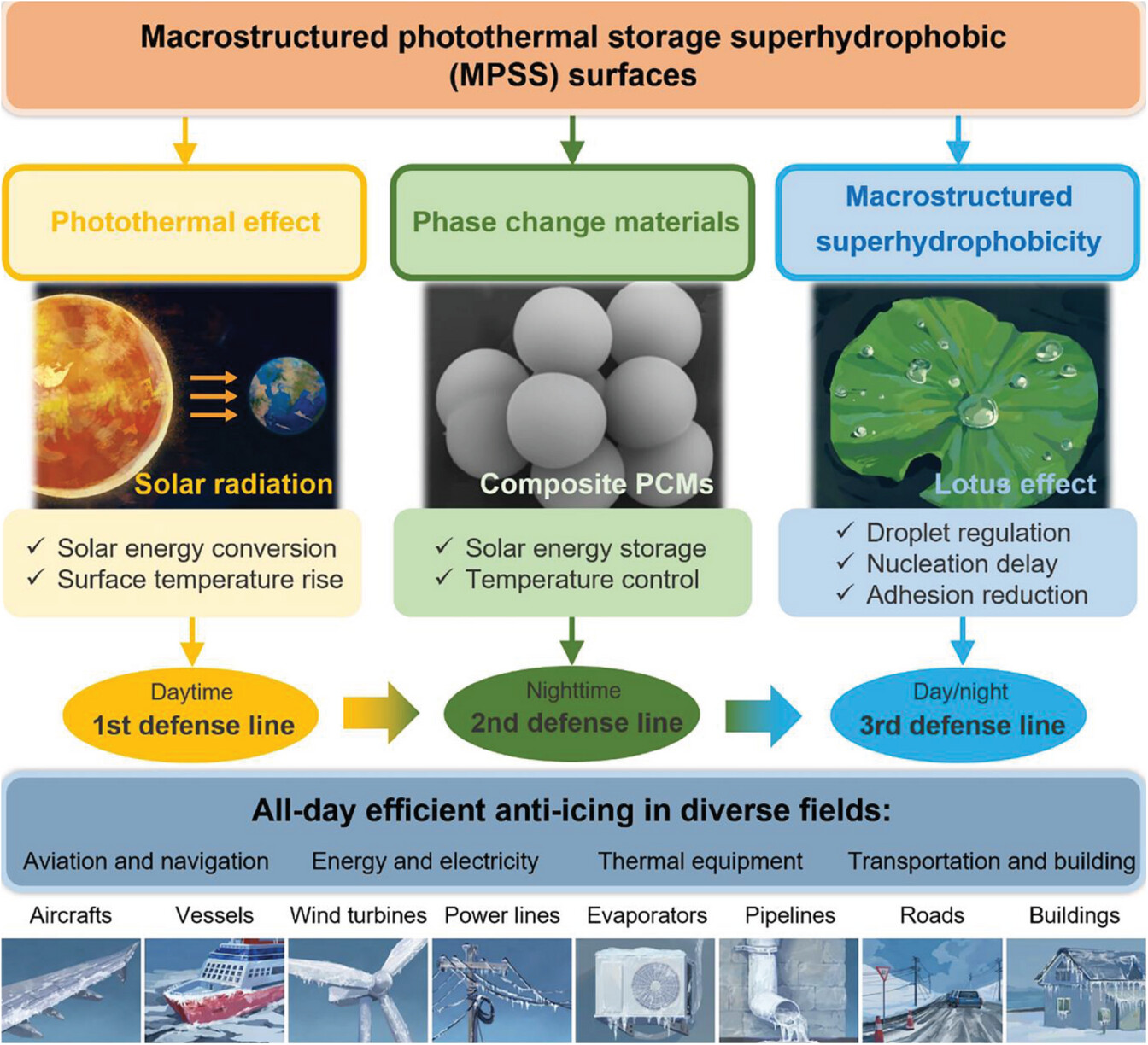 MPSS表面构筑多重防线以实现各类应用中的全天高效防冰:(1)以超疏水表面为载体,利用超疏水表面本身抑制成核、降低粘附的防结冰特性;(2)结合仿生结构设计,调控液滴运动,弱化固液接触,强化液滴脱离,进而增强表面防结冰能力;(3)利用光热效应,通过光热转化使表面升温,避免低温条件下表面超疏水性的失效;(4)借助相变材料能量存储、稳定控温的特性,解决不同条件下光热效应能量供需不平衡问题。