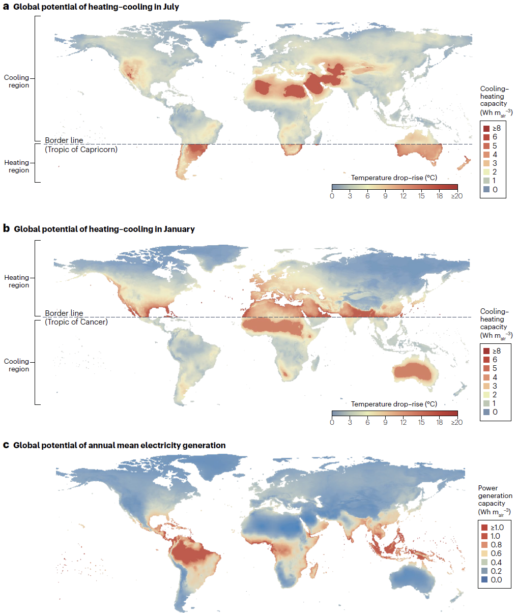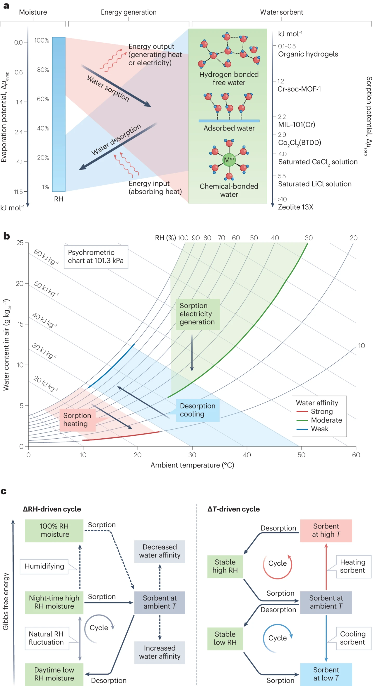 近日,上海交大伟德国际1946ITEWA创新团队在Nature Reviews Materials上发表题为“Sustainable Moisture Energy”的Perspective论文,从热力学、传热传质学、反应动力学等视角对湿度诱导能源收集这一新兴技术进行了分析研究,评估了该技术在全球不同气候工况下的湿度诱导制冷/制热/发电的产能潜力,为该领域的能源材料热设计构建与能源器件研发提供了新思路。制冷与低温工程研究所博士后许嘉兴为论文第一作者、博士生王鹏飞为共同第一作者,李廷贤研究员为通讯作者,王如竹教授与清华大学曲良体教授为共同通讯作者。该论文入选Nature Reviews Materials期刊亮点论文。