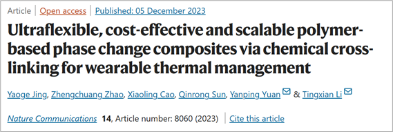 近日,上海交大伟德国际1946ITEWA团队在国际期刊Nature Communications上发表了题为“Ultraflexible, cost-effective and scalable polymer-based phase change composites via chemical cross-linking for wearable thermal management”的研究论文。该论文由制冷与低温工程研究所ITEWA团队与西南交通大学团队合作完成,为规模化制备柔性定形相变储热复合材料和可穿戴的热管理器件提供了新思路。制冷与低温工程研究所博士后赵正创和西南交通大学硕士研究生敬瑶阁为论文共同第一作者,李廷贤研究员和西南交通大学袁艳平教授为共同通讯作者,王如竹教授对该工作给予了指导和建议。