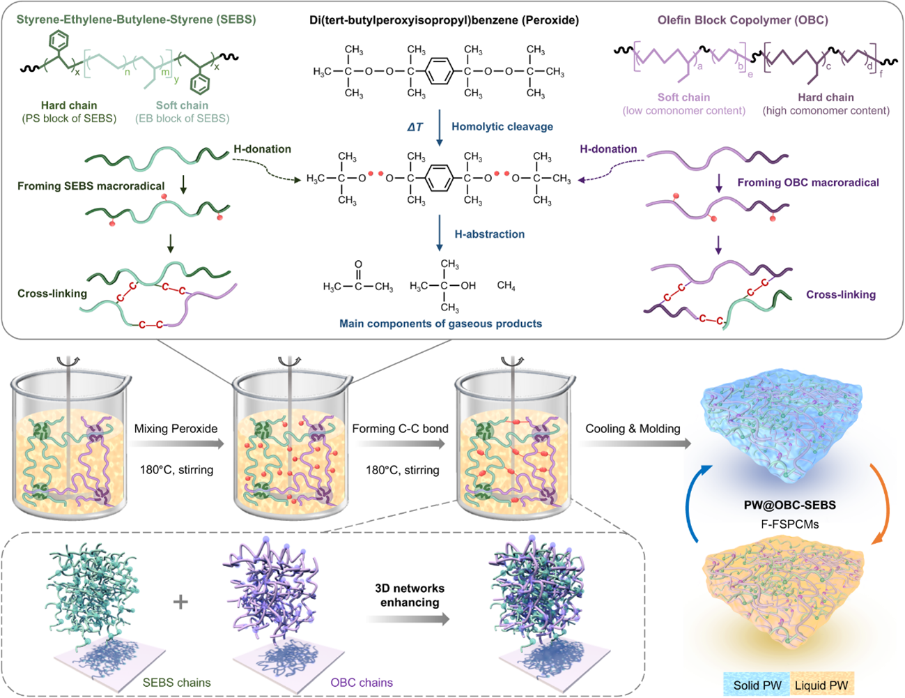 研究人员成功制备了超柔性定形相变储热复合材料PW@OBC-SEBS,将相变材料PW嵌入C-C键强化的SEBS-OBC双聚合物网络结构,实现了相变材料的定形封装,可以在加热-冷却循环条件下维持良好的热稳定性和柔性特征。通过化学反应路径分析和实验测试,研究发现该化学交联方法合成的储热复合材料相对传统物理混合技术制备的复合材料,展现出显著的聚合物化学交联增韧效应和热稳定性,断裂伸长率达560%。该材料经过500次循环试验后仍保持稳定的柔性功能,且在高于相变温度的热空气和热水环境下具有稳定的定形效果而不出现液体泄漏,相变焓值高达176 kJ/kg,具有优异的储热能力。