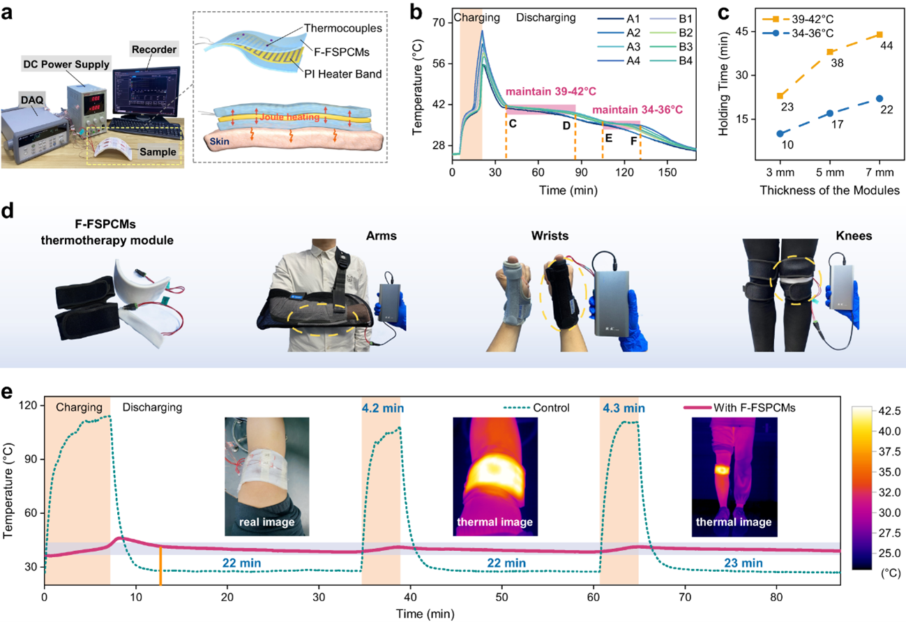 研究人员揭示了过氧化物分解自由基驱动聚合物C-C键生成强化的化学交联网络是实现储能材料优异热性能和力学性能的根本原因,提出了可规模化制备柔性定形相变储热复合材料的新方法,实验室单次制备质量可达20 kg。研究人员进而设计构建了可用于人体热舒适性调节的可穿戴便携式相变储能热管理器件,表现出了长效稳定的储热和温度调控能力,实现了人体热疗39~42 °C热舒适温区的可穿戴热管理。