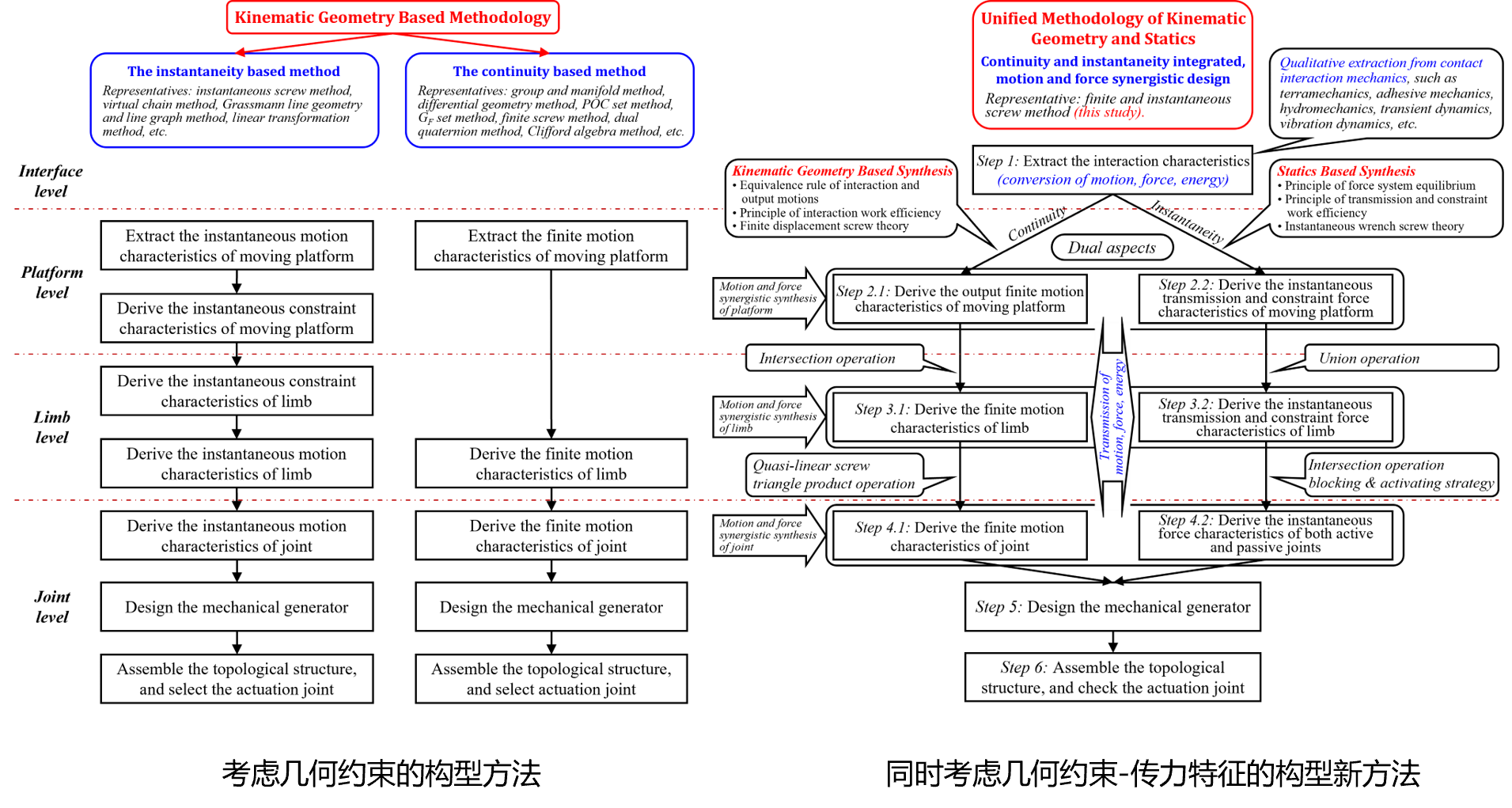 论文以着陆外星的可移动式新型着陆器重大需求为背景,聚焦现代装备创新研发过程的机构构型综合阶段,需要同时考虑运动特性要求和传力性能要求,而目前的机构构型理论仅考虑运动特性要求,未考虑传力性能要求的问题。论文回顾了1983年以来机器人机构学领域发展的运动几何学体系下的11种拓扑综合方法,针对仅考虑机构运动特征而忽视传力特征、做功能效以及机-环境力交互特性等不足,创新性提出兼顾运动几何学与力学的运动特征与传力特性双轨并重、协同综合的整机构型设计思想,揭示了拓扑综合层面力流及其对运动做功效率在平台、支链和关节层面作用与传递规律,建立了考虑几何约束和传力特征的拓扑综合新方法,开创了面向机-环境力交互的共融机器人构型设计新范式。