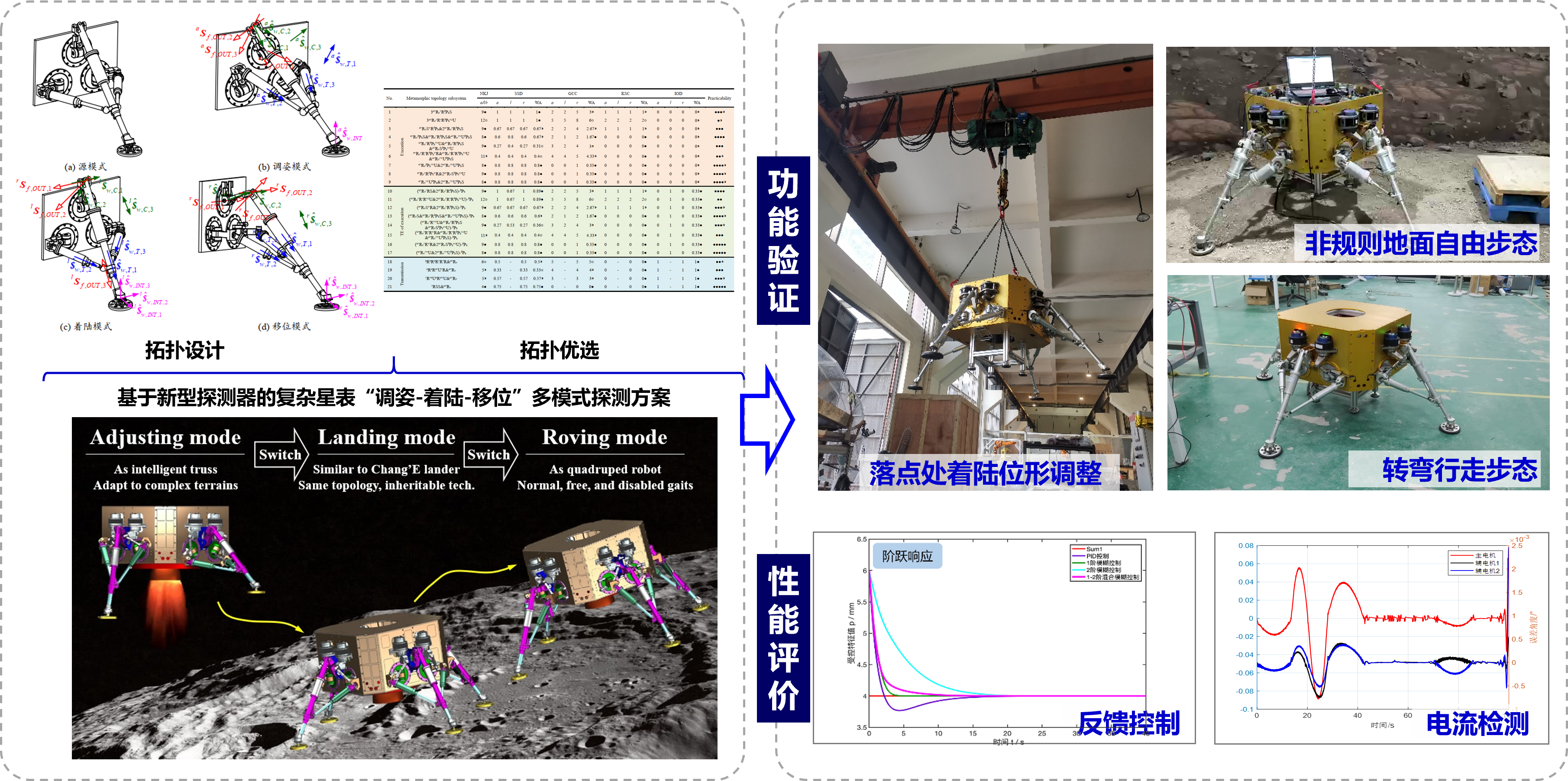 运用所建立的方法,论文提出了面向工程需求的调姿-着陆-移位多模式可重构新型探测器拓扑系统设计架构,优选出实验样机构型,研制了实验样机并开展了实验验证研究,实现了在构型设计阶段即能保障有效提升着陆瞬时冲击负荷能力和重载移位行走能力。