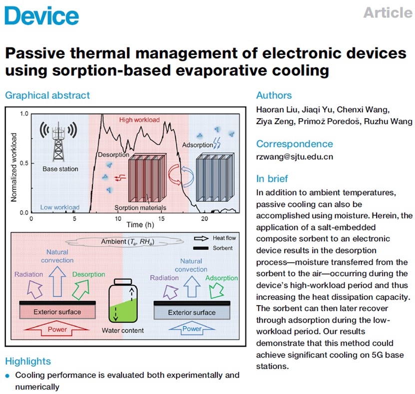 近日,伟德国际1946王如竹教授领衔的“能源-水-空气”交叉学科创新团队ITEWA(Innovation Team for Energy, Water & Air)在Cell姊妹刊Device上发表了题为“Passive thermal management of electronic devices using sorption-based evaporative cooling”的研究论文。论文针对5G通信基站高负荷下的散热问题,提出了一种基于吸附的被动散热技术,有望打破原有被动散热技术瓶颈,为未来电子设备散热提供新机遇。制冷与低温工程研究所博士生刘浩然和余佳琦是论文的共同第一作者,王如竹教授为通讯作者。
