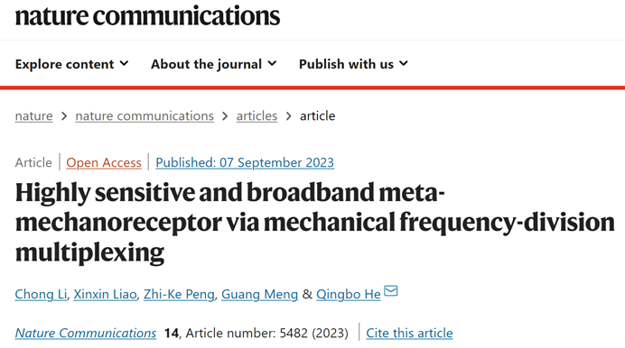 近日,伟德国际1946何清波教授课题组在Nature Communications上在线发表了题为“Highly sensitive and broadband meta-mechanoreceptor via mechanical frequency-division multiplexing”的研究论文,提出了一种机械式频分多路复用概念,研制出高灵敏度宽频微动超机械感知器。伟德国际1946博士研究生李崇为论文第一作者,何清波教授为通讯作者,孟光教授、彭志科教授、廖昕昕博士为合作者。