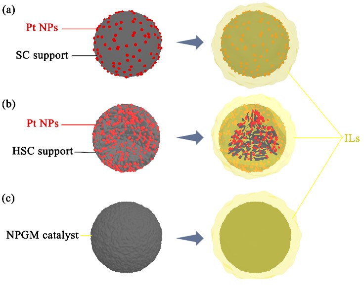 质子交换膜燃料电池(proton exchange membrane fuel cells,PEMFCs)具有高能量密度、零污染等特点,成为汽车交通和便携式能源领域最具潜力的选择之一。然而,由于催化层中大量使用铂基催化剂,导致燃料电池汽车成本居高不下,严重阻碍其商业化应用。近年来,得益于高氧溶解度、高质子电导率、高热稳定性和化学稳定性,离子液体被用于质子交换膜燃料电池中的催化剂修饰(solid catalysts with an ionic liquid layer,SCILL),得到了优异的氧还原活性和燃料电池性能,因此受到广泛关注。