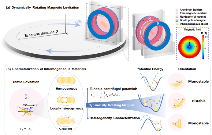 动态抗磁悬浮检测方法的出发点是通过设计可调控的动态离心力来放大悬浮物内部的密度差异。理论与实验研究揭示了可调离心力、非线性磁力与内部密度异质性对物体悬浮稳态的影响规律。非线性磁力与可调离心力的设计实现了悬浮物体稳定平衡态的调节,悬浮稳态特征可用于辨识物体内密度异质性差异,如均质与具有密度梯度的材料分别呈现不同方向的单稳态悬浮定向,而具有局部缺陷的材料具有双稳态或双稳态-单稳态悬浮定向特性。利用物体的非线性悬浮特征表征内部密度异质性,为推动抗磁悬浮方法走向材料非接触、无标记、无损检测实际应用提供了新思路。