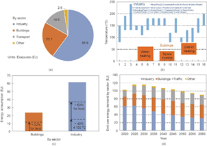 (a) 2020年中国终端能源需求;(b) 建筑和工业的用热温度范围;(c) 与热相关的最终使用能源需求;(d) 中国终端能源需求预测