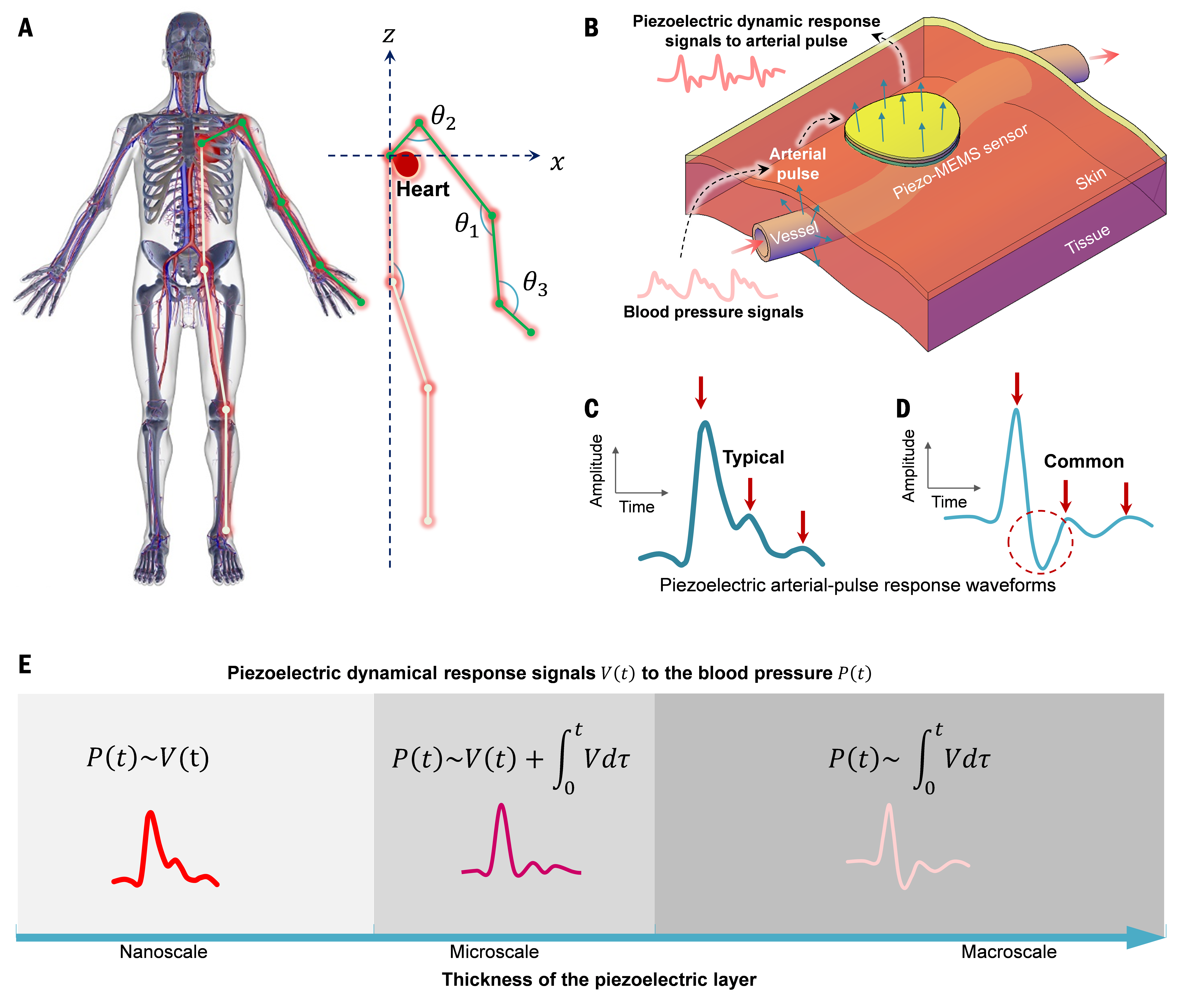 穿戴式血压连续监测技术因其监测过程的便携性而得到广泛研究,为解决传统血压测量的问题提供了重要的发展途径。目前报道的穿戴式压电脉搏传感技术在监测到的脉搏波方面表现出很大的差异性,一部分研究认为压电脉搏波与动脉血压波存在积分关联的波动特性,而另一部分研究则呈现出压电脉搏波与血压波一致的波动特性。这种尚未厘清的关联关系不仅影响传统穿戴血压监测方法中脉搏波特征点选取的合理性,也影响基于脉搏波直接评估动脉血压波动特征的可靠性。因此,实现穿戴式血压连续监测仍是一个重大的挑战,阐明动脉脉搏压电响应的动力学特征,对于穿戴式脉搏传感技术和连续血压监测系统的发展是非常必要的,也具有重要应用价值和现实意义。