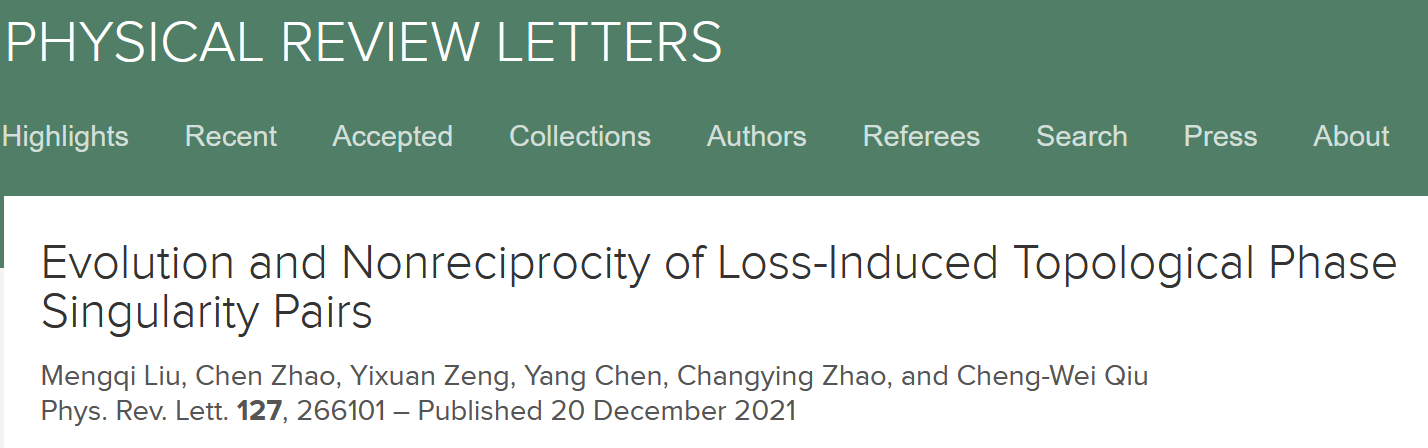 近日,伟德国际1946赵长颖教授团队在国际物理学期刊Physical Review Letters上发表“Evolution and nonreciprocity of loss-induced topological phase singularity pairs”研究论文,团队在非互易体系下,研究了损耗诱导的谱空间拓扑相位奇点的非对称动态演化,及其在打破热辐射基尔霍夫定律方面的应用。论文第一作者是博士生刘梦琦,通讯作者是赵长颖教授和新加坡国立大学仇成伟教授。