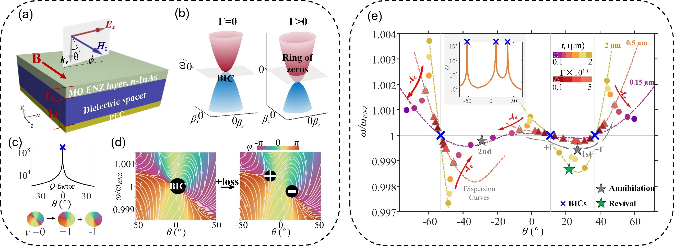 研究团队利用磁光材料,通过研究由连续谱中的束缚态(BICs)分裂的拓扑相位奇点对(topological phase singularity pairs, TPSPs)在光谱-参数空间的非对称特性,系统地揭示了材料损耗和辐射损耗,对非对称TPSPs产生、演化和湮灭的影响机制,其高Q因子特性使得在低外加磁场条件下,也能观察到很强的非互易性。特别地,不同于实空间的涡旋光和动量空间的偏振奇点,由损耗诱导的存在于光谱-参数空间的相位奇点,作为一类新的拓扑特征被发现:在光谱-参数空间相位图上,环绕该点可得到整数的拓扑荷数;当改变系统参数时,这些奇点并不会突然消失,仅改变他们在光谱-参数空间的位置。此外,通过控制系统参数,该项研究建立了非互易体系下,BICs的数目与角度位置的关系,保证了在宽角度范围内,对拓扑保护的TPSPs的主动调控。