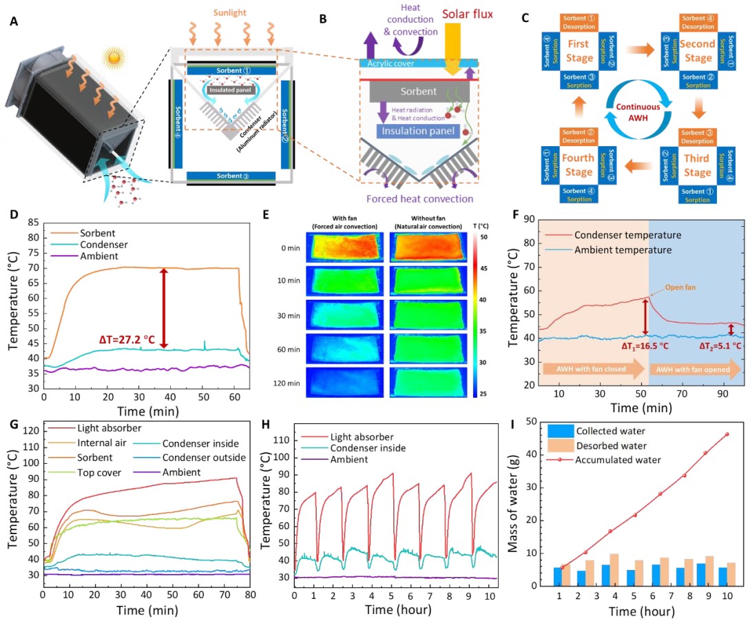 为了解决传统间歇式空气取水器工作过程中吸附阶段不能产水的弊端和单日仅能实现单次吸附-解吸取水循环的局限,文章开发设计了一种采用多吸附床切换式的连续空气取水策略。引入强制对流,一方面强化了水分子从环境传输至吸附剂孔道的传质速率,另一方面带走了吸附剂吸附产生的吸附热,从而促进了吸附剂的吸附速率,同时流经冷凝器翅片带走了水蒸气释放的冷凝热,一举多得实现了空气取水装置的传热传质协同强化。文章构建的半主动式快速循环连续空气取水器可以实现一天8次的吸附-脱附取水循环,室内太阳能模拟工况下取水量达到2120 mLwater/kgsorbent/day,户外低湿度工况的太阳能取水实验表明在超过35°C的高温外界环境中实现了1050 mLwater/kgsorbent/day的取水量。该工作为实现紧凑、便携、规模化的高效空气取水器提供了新思路。