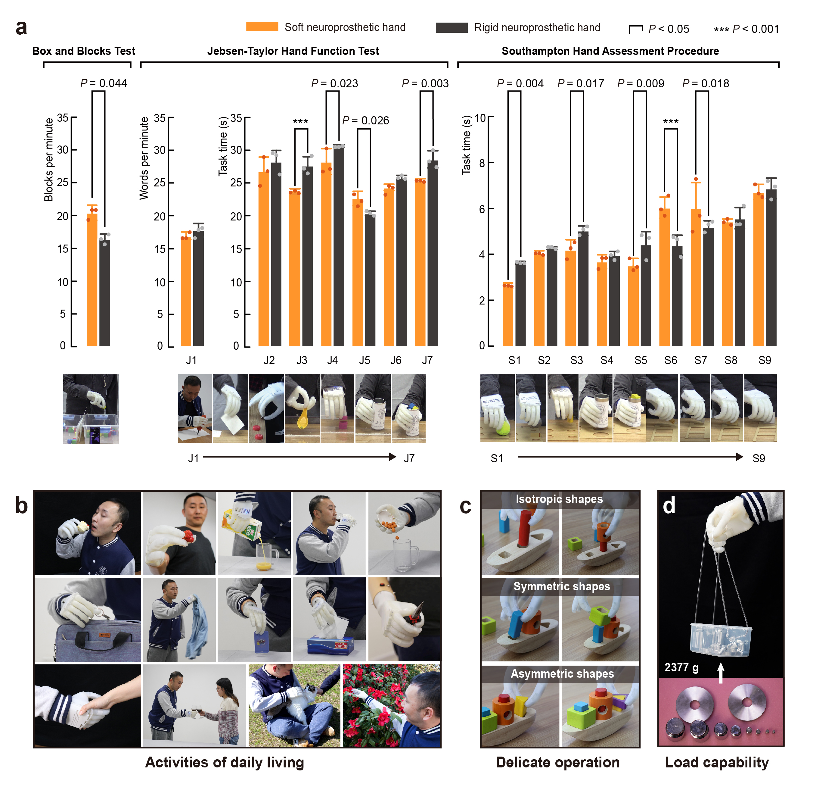 为了评估软体神经假肢手的使用性能,两位截肢患者按指定范式分别完成了软体假肢手和刚性假肢手的标准量化测试实验。实验结果统计分析表明,软体假肢手在速度和灵巧性方面优于传统的刚性神经假肢。当抓握草莓、面包和纸杯等柔软、易碎物品时,软体神经假肢手展示了更强的性能优势。此外,因软体假肢手重量大幅降低,受试者佩戴使用的舒适性明显提升。