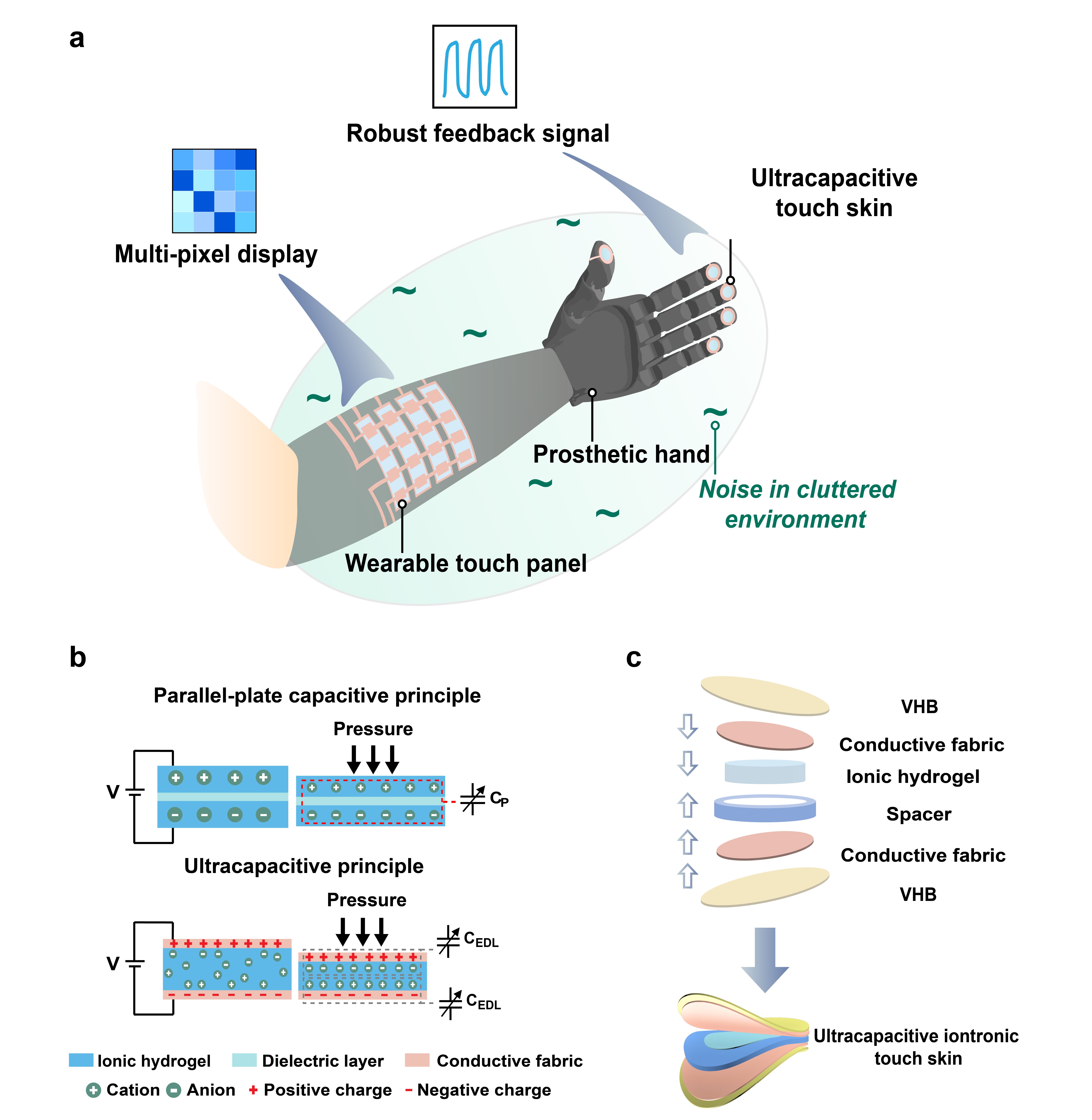 本研究设计的压力传感器主要由离子导电的水凝胶和导电金属织布组成,与传统的pF级平行板电容压力传感机理不同,该器件采用了新型的超高电容机理,将平行板电容中间绝缘的介电层替换为离子导电的水凝胶层,水凝胶与金属电极在界面处形成了双电层,金属电极表面的正负电荷分别吸引水凝胶中相反极性的离子,在界面处大量微观的离子-电子对形成微电容,由于其间隙由毫米级降低至纳米级,其电容值显著增强,在宏观上形成了nF至μF级的超高单位面积电容。