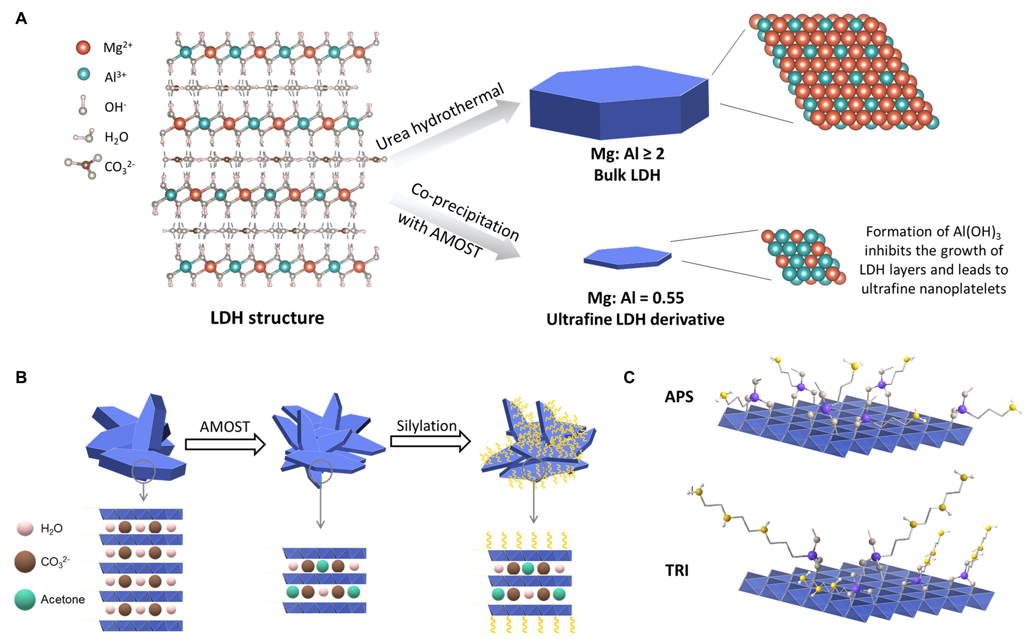 单分子层胺嫁接MgAl-LDH的制备示意图:A) LDH衍生载体的合成;B) AMOST处理的LDH上的硅烷化反应;C) 胺嫁接的结构