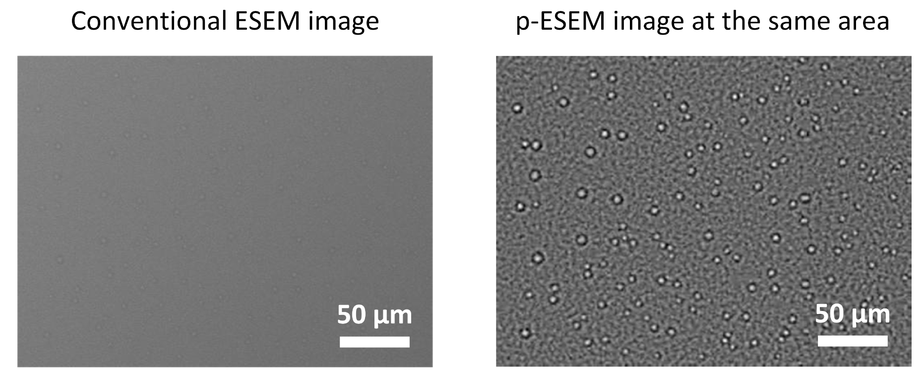 传统环境扫描电子显微镜(左)和相位增强环境扫描电子显微镜(右)对成核点分布的成像效果对比
