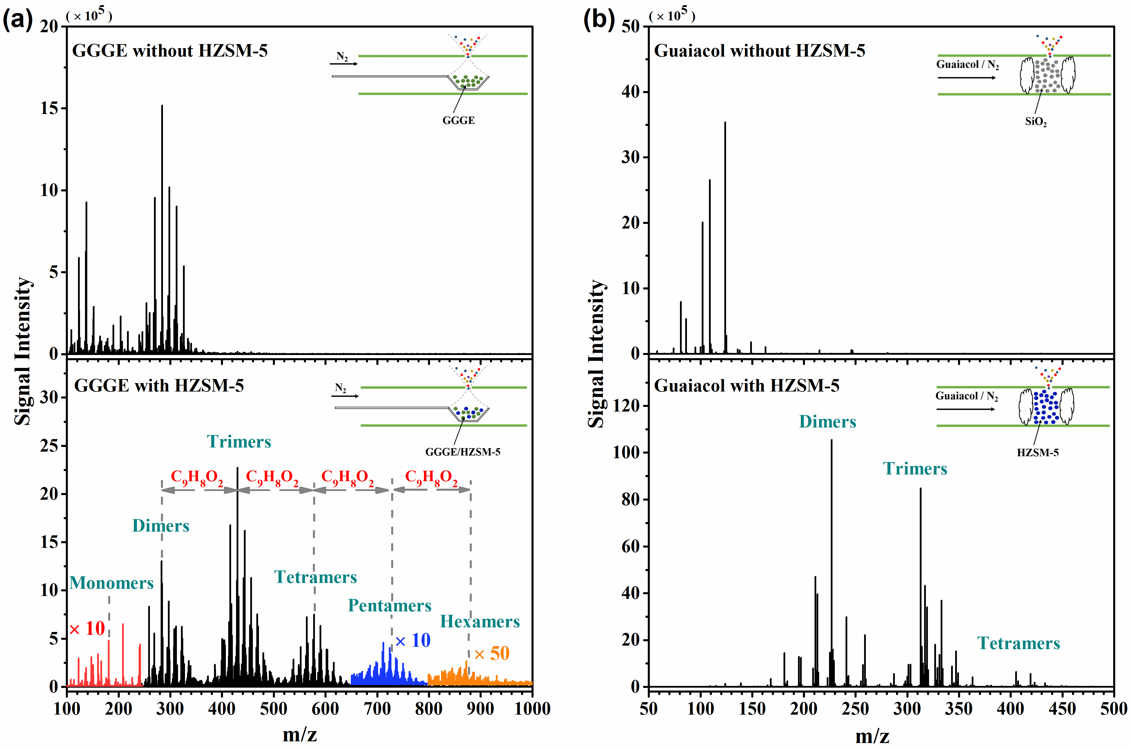 研究工作借助课题组近期发展的原位大气压光电离/高分辨质谱方法,突破了传统方法在测量大分子活泼产物方面的局限,在分子筛催化木质素热解过程中首次发现了酚类聚合物,探测到的聚合物最高可达六聚体。这是迄今为止有关“酚池”机理的最直接实验证据,该工作证实“酚池”类聚合物是分子筛催化木质素转化过程中的重要中间产物。这一发现将有助于深入理解催化剂的失活机理,并为催化剂的优化提供了新的思路。