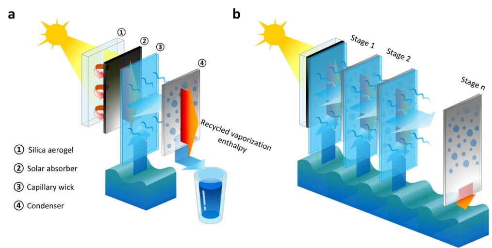 全被动式的太阳能海水淡化是解决海水淡化技术适应性的完美方案,且适用于缺乏基建和偏远地区,然而其效率一直偏低(约35%)。近年来,太阳能界面蒸发为高效便携式海水淡化提供了新的思路,成为了能源科学、材料科学和热科学的交叉领域研究热点,但在其效率仍然十分有限(约100%)。本研究提出的“界面局部加热型多级太阳能蒸馏架构”结合了太阳能界面局部加热和蒸汽焓回收,突破了前述研究的局限,显著提升了被动式太阳能海水淡化的效率。