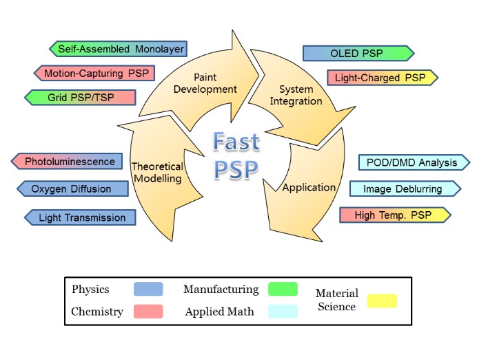 课题组近年来针对快响应PSP测量原理、方法及应用开展了广泛研究,相继在Experiments in Fluids、Physics of Fluids、AIAA Journal 、Sensors & Actuators A/B、Measurement Science & Technology 等期刊上发表论文。研究成果已在直升机、高超声速飞行器与航空发动机等领域的基础研究与型号测试中得到成功应用,并得到国家自然基金杰青项目与面上项目的资助。