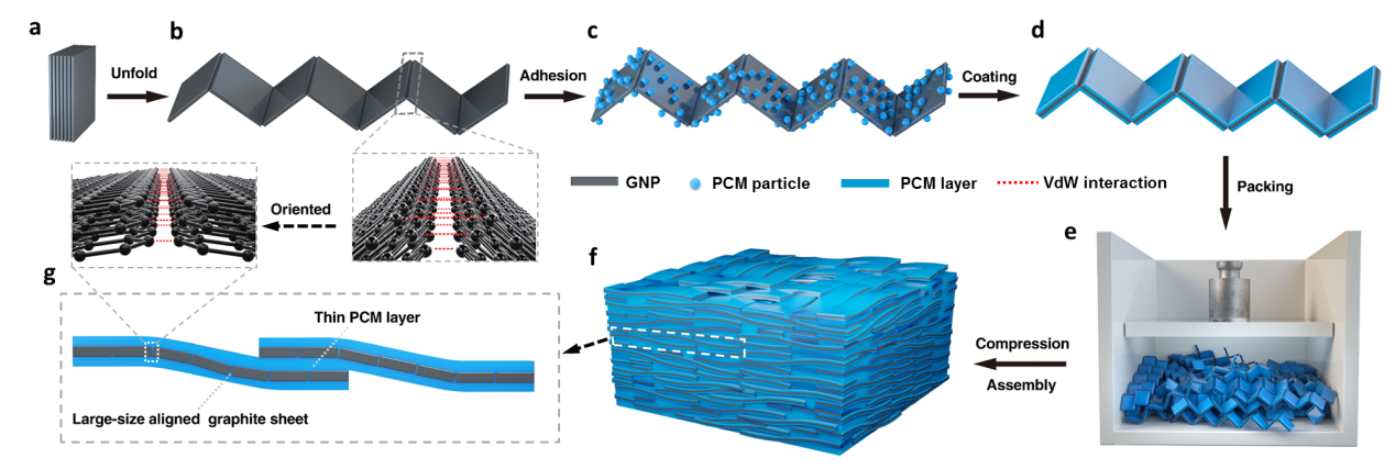 随着能源紧缺问题日益紧张,储能技术越来越受到重视。储能技术可以实现能源供给与需求在时间、空间及强度上的匹配,提高能源利用效率。全球90%的能源预算围绕热的转换、输运和储存,因此,热能储存技术在热量调配和提高能源综合利用效率方面具有非常重要的作用。基于相变材料的潜热储存具有储热密度高、放热过程温度近似恒定、结构简单、成本低等优点。然而,相变材料的热导率较低严重限制其充/放热功率及热响应速度,进而制约实际应用。现有复合相变材料合成方法主要采用二维碳材料(如石墨纳米片、多层石墨烯及单层石墨烯)用作添加剂强化相变材料的热导率,这些二维碳材料在微纳米尺度时具有超高的本征热导率(>1500 W/mK)。然而将这些微纳米尺度的高导热添加剂与相变材料复合时,因接触热阻较大和导热的各向异性导致复合材料的热导率不理想,即使二维碳材料的含量高达50 wt%,想获得热导率高于10W/mK的复合相变材料仍然具有挑战性。