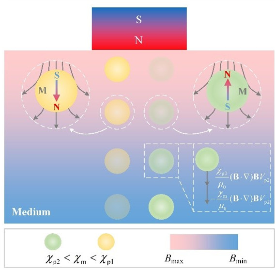 非标记操控方法在材料科学、生命科学与医疗等领域有着独特的应用优势,吸引了科学界与工业界的广泛关注。近年来,非标记磁操控技术因其成本低、操作灵活等优势成为热点研究领域之一。与铁磁材料在磁场作用下受到吸引力的直观感受相反,抗磁材料在磁场作用下受到排斥力作用。自然界中多数被认为没有磁性的物质多数为抗磁材料,由于通常其磁化率较小(通常在10-6)而被忽略。基于磁阿基米德原理的非标记磁操控技术通过引入顺磁性介质,增大被操控对象与周围介质磁化率的差异性,从而放大抗磁力的作用效果,“推动”被操控对象运动到局部磁场最弱的区域。相比于传统标记磁操控方法,基于磁阿基米德原理的非标记磁操控技术在可操控性、材料普适性及经济性等方面都有明显优势,同时还消除了标记物对细胞等生物材料的潜在危害,通过设计构造和控制局部磁场梯度,使得操控技术更加灵活高效,可实现被操控对象的聚集与分离、定向与组装等功能化技术。