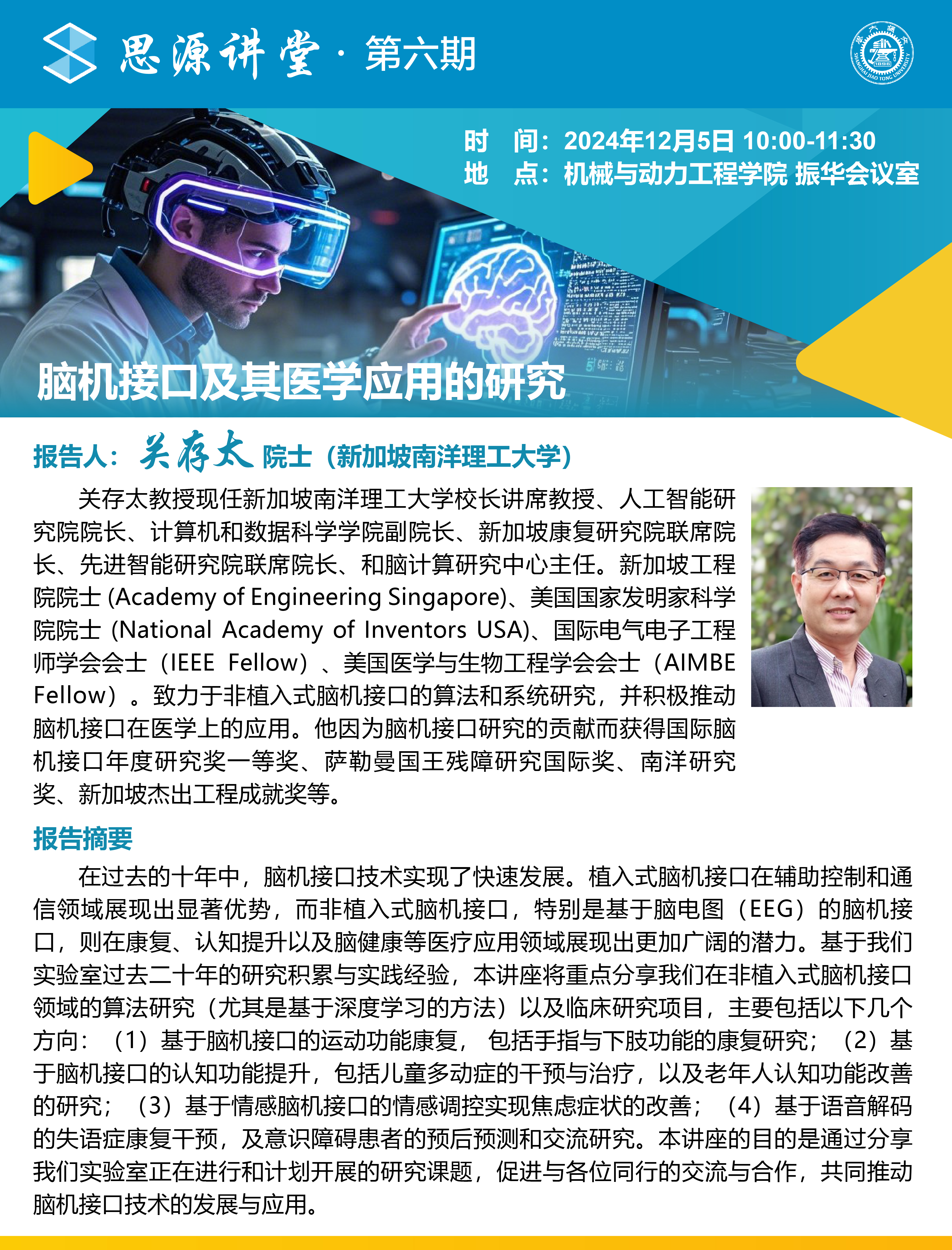 关存太教授现任新加坡南洋理工大学董事长讲席教授、人工智能研究院经理、计算机和数据科学公司副经理、新加坡康复研究院联席经理、先进智能研究院联席经理、和脑计算研究中心主任。关教授是新加坡工程院院士 (Academy of Engineering Singapore)、美国国家发明家科公司院士 (National Academy of Inventors USA)、国际电气电子工程师学会会士(IEEE Fellow)、美国医学与生物工程学会会士(AIMBE Fellow)。关教授致力于非植入式脑机接口的算法和系统研究,并积极推动脑机接口在医学上的应用。他因为脑机接口研究的贡献而获得国际脑机接口年度研究奖一等奖、萨勒曼国王残障研究国际奖、南洋研究奖、新加坡杰出工程成就奖等。
