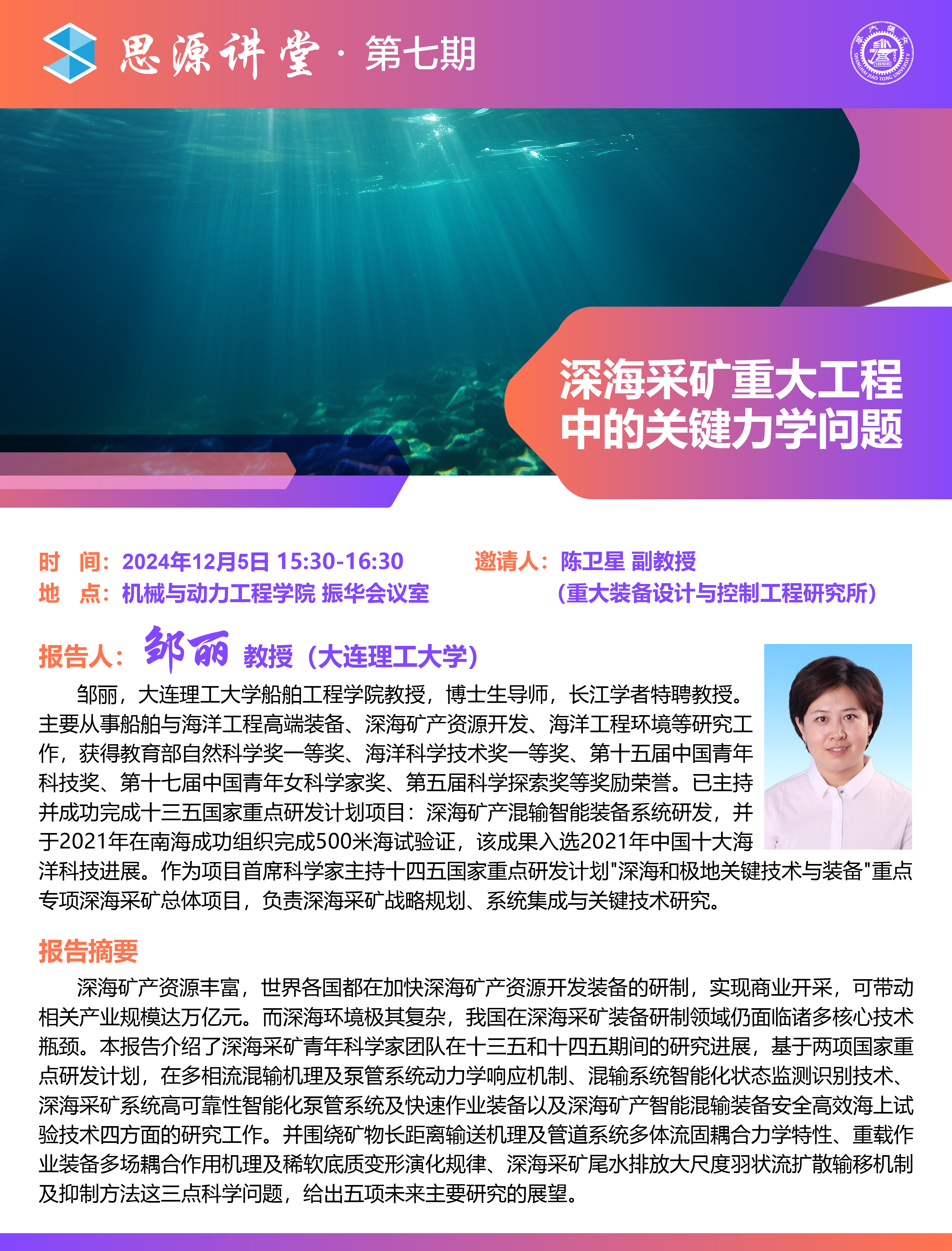 邹丽,大连理工大学船舶工程公司教授,博士生导师,长江学者特聘教授。主要从事船舶与海洋工程高端装备、深海矿产资源开发、海洋工程环境等研究工作,获得教育部自然科学奖一等奖、海洋科学技术奖一等奖、第十五届中国青年科技奖、第十七届中国青年女科学家奖、第五届科学探索奖等奖励荣誉。已主持并成功完成十三五国家重点研发计划项目:深海矿产混输智能装备系统研发,并于2021年在南海成功组织完成500米海试验证,该成果入选2021年中国十大海洋科技进展。作为项目首席科学家主持十四五国家重点研发计划"深海和极地关键技术与装备"重点专项深海采矿总体项目,负责深海采矿战略规划、系统集成与关键技术研究。