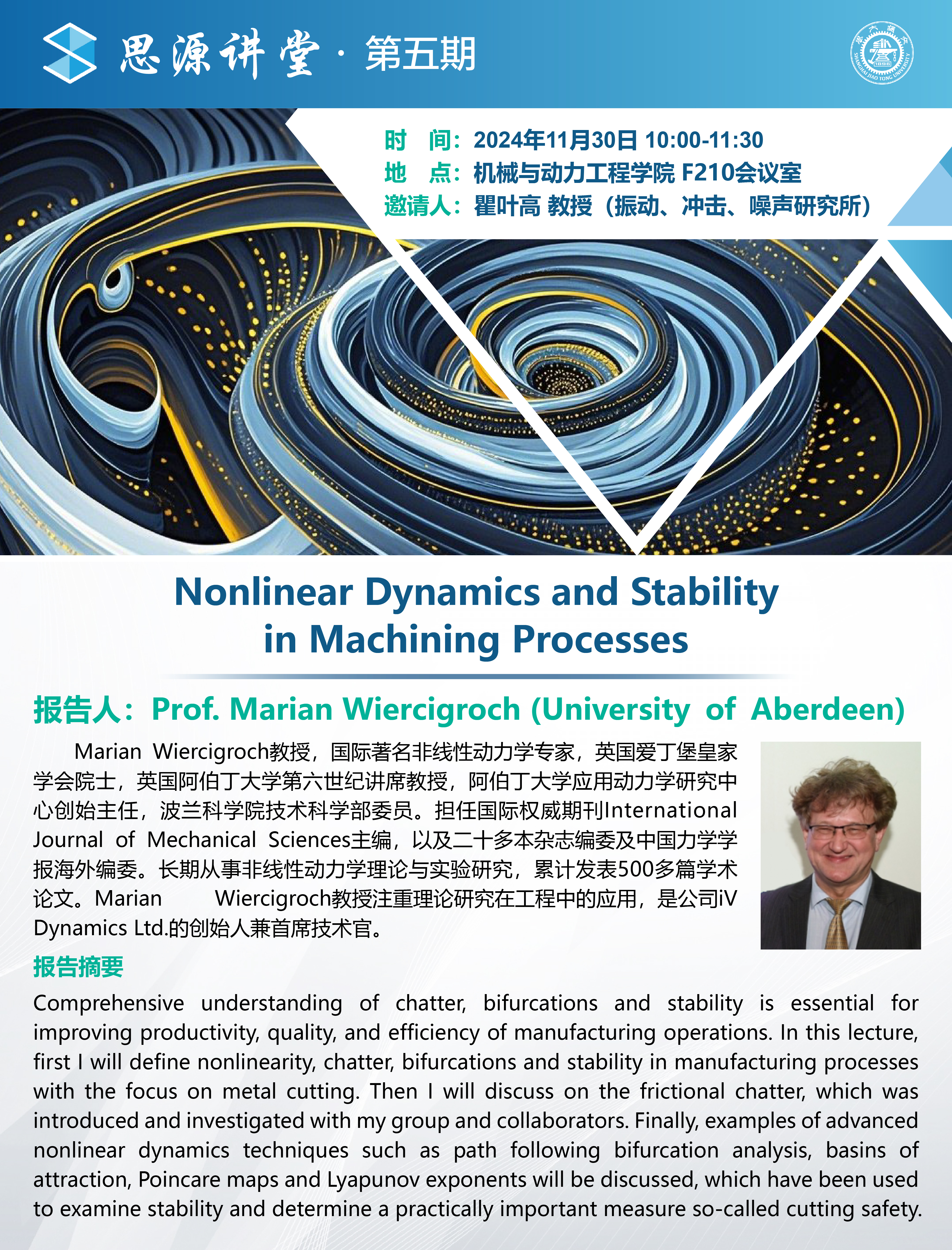 Marian Wiercigroch教授,国际著名非线性动力学专家,英国爱丁堡皇家学会院士,英国阿伯丁大学第六世纪讲席教授,阿伯丁大学应用动力学研究中心创始主任,波兰科公司技术科学部委员。担任国际权威期刊International Journal of Mechanical Sciences主编,以及二十多本杂志编委及中国力学学报海外编委。长期从事非线性动力学理论与实验研究,累计发表500多篇学术论文。Marian Wiercigroch教授注重理论研究在工程中的应用,是公司iV Dynamics Ltd.的创始人兼首席技术官。
