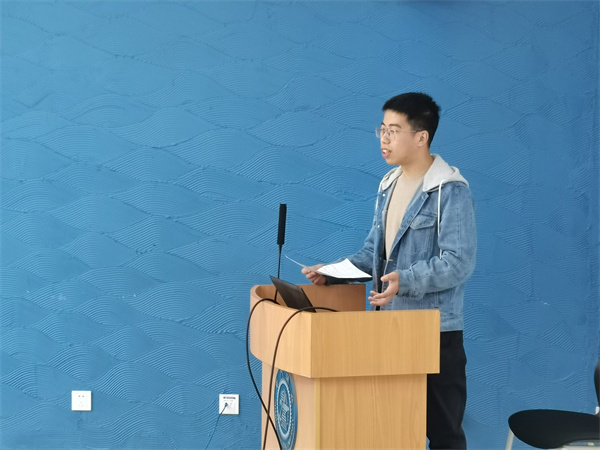 会议第一项,马瑞作为扶贫工作代表为同学们讲述了扶贫期间的故事。为积极响应国家精准扶贫政策的号召,马瑞于2018年1月赴新疆喀什市巴格阿瓦提乡巴格霍依拉村开展扶贫工作,担任扶贫书记助理。首先,他从走访调研、产业扶贫、就业扶贫、文化扶贫、教育扶贫五个方面对扶贫纪实进行了讲述,分享了贫困户认定、万寿菊种植、国语课程教授、服装厂开设、房屋建筑翻新等工作中曾遇到的问题与挑战。他指出,工作开展的根本是“扶贫先扶志”,只有改变乡亲们的贫困思维,才能够真正将扶贫工作落实到位。随后,马瑞讲述了与当地同志们共同奋斗的故事,他指出虽然基层条件苦、工作开展难,但是需要有一群人走到国家需要的地方去,为人民办实事,为人民谋幸福。最后,他向党员同志将讲解了选择去基层锻炼的初心,年轻人需戒骄戒躁,求真务实。全体党员感触万分,表示受益良多。