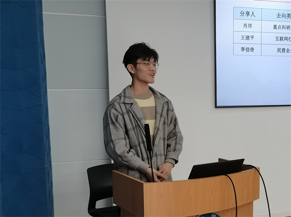 会议第二项,支部内毕业生党员就业分享。肖邦、王建平、李佳奇三名党员先后分享了就业求职过程中的心得。他们首先对就业单位进行了初步介绍,随后分享了就业过程中遇到的问题与收获,鼓励与会同志明确自身偏好、提前做好职业规划并勇于实践。他们指出,做选择是求职过程中非常重要的环节,人生处处是围城,浩渺行无极,扬帆但信风,不忘初心、保持真诚、勇往直前是最好的应对法。