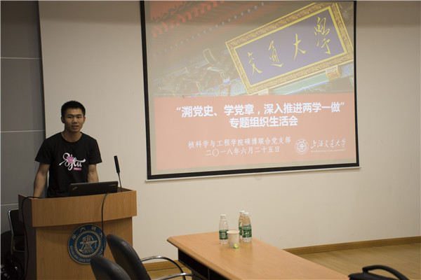 6月25日,核公司硕博联合党支部在机械楼F310开展了以“溯党史、学党章,深入推进两学一做”为主题的专题组织生活会。会议由硕士生党员徐德辉主持。核公司思政老师余天佐出席了本次组织生活会,硕博联合党支部的党员和部分积极分子参与了本次会议的学习和讨论。
