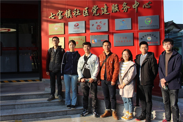 第二分队乘坐大巴前往七宝镇社区党建服务中心。一下车,大家纷纷选择在门前合影,留下宝贵的红色纪念。