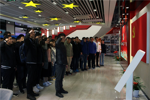 随后,服务中心的讲解员带领交大学子全方位地了解七宝镇党建情况。在七宝党建服务中心第一层,第二分队成员观看了七宝古镇的党史短片。七宝古镇党史共有九十年历史,革命前辈们长期坚持地下斗争,并打响了著名的七号桥战斗。在第二层,成员们细心了解七宝镇全方面的党建工作情况,其中区域党建联盟是党建工作的亮点之一。作为党建引领下的典型发展成果,九星村让交大学子感受到了七宝镇发展的强大魅力。活动最后,第二分队成员一起进行入党宣誓活动,重温入党誓词。