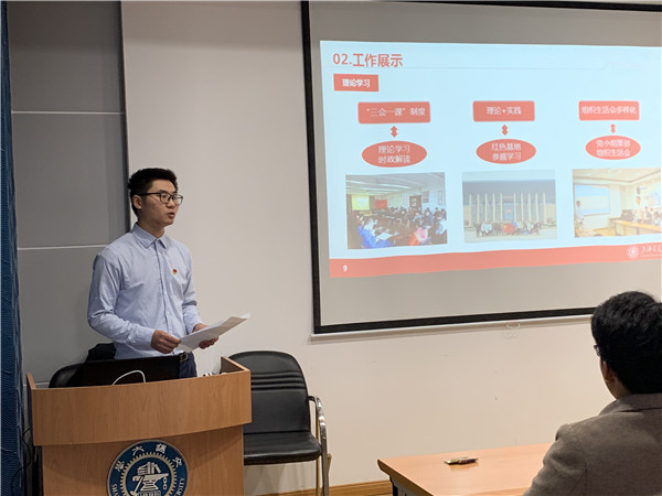 随后进行了2018年度 “双评双议双公开”民主生活会。赖平代表支委会进行了年度述职,从支部建设、理论学习、规范考核、党员风采、学术成长、共建共行、就业引导、服务同学和使命担当这七个方面,总结了支部一年来在思想引领、组织建设、发展工作和特色活动等方面取得的成绩;同时阐述了支部2019年的工作展望,保证做到“强组织、树品牌、重专业、讲奉献”。