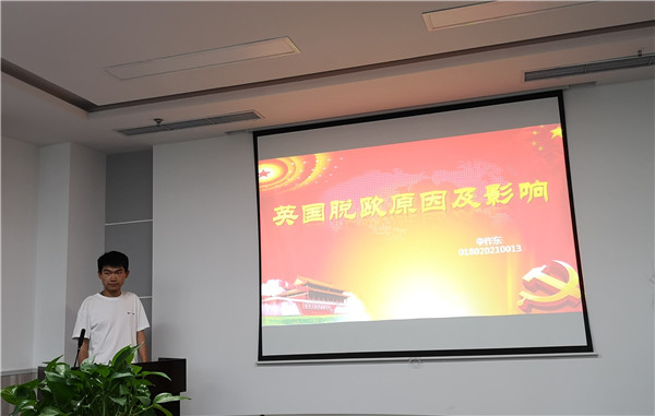 接着,李作东同学向大家介绍了近期引起国际社会广泛关注的英国脱欧事件。他结合丰富的调研材料,详细介绍了英国脱欧的原因和历程,并深入分析了英国脱欧的本质以及后续对各方带来的影响。