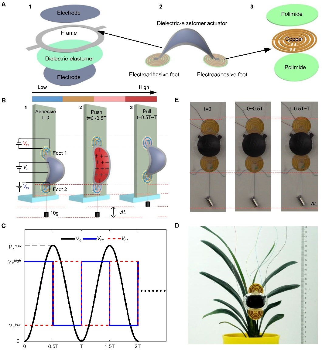 伟德国际1946朱向阳、谷国迎团队与麻省理工公司赵选贺团队合作,研制了首个由介电弹性体人工肌肉和静电吸附脚掌构成的软体爬壁机器人(自重2g,身长85mm),其中介电弹性体人工肌肉用于驱动机器人本体的快速周期运动,静电吸附脚掌用于产生时间和空间可控的静电吸附力,机器人的稳定快速爬壁运动由介电弹性体人工肌肉和静电吸附脚掌的协同控制来实现。