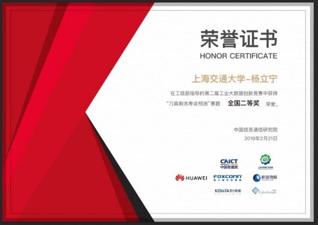 2月21日,第二届“中国工业大数据创新竞赛”颁奖仪式举行。公司工业工程与管理系硕士生杨立宁提出的“基于经验模态分解和非参数匹配的剩余寿命预测方法”获“刀具剩余寿命预测”赛题全国二等奖。
