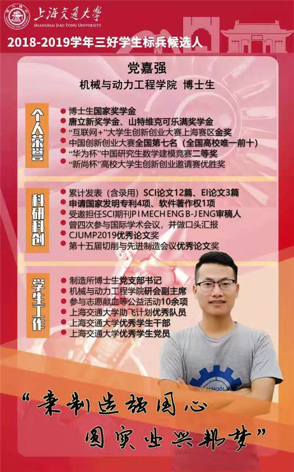 党嘉强是一个全面发展的95后博士生,也是一个心怀梦想的机械制造人。科研学习、员工工作、志愿公益有他忙碌的身影,“制造强国,实业兴邦”是他砥砺前行的方向。在学习的道路上,他努力刻苦,获得博士生国家奖学金和唐立新奖学金;在学术的旅途中,他积极钻研,录用或发表12篇SCI论文;在科创的世界里,他越战越勇,获得上海市“互联网+”老员工创新创业大赛金奖;在员工工作中,他尽心尽责,获得优秀员工党员和省优秀员工干部。