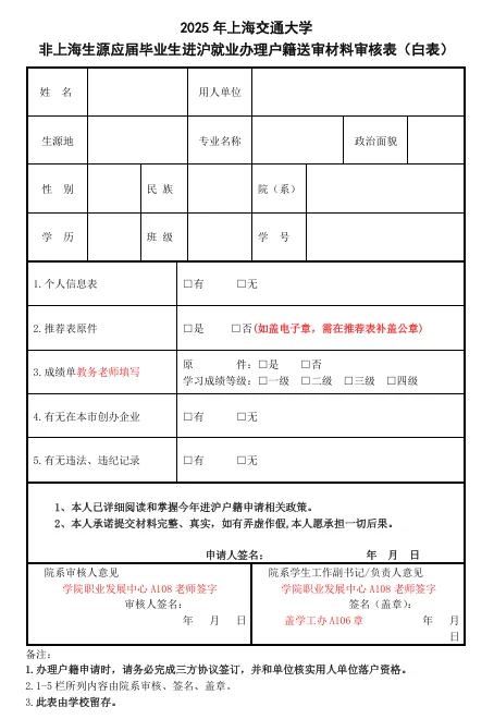 1.附件一:2025年《非上海生源应届毕业生进沪就业办理户籍送审材料校内审核表》(即白表);