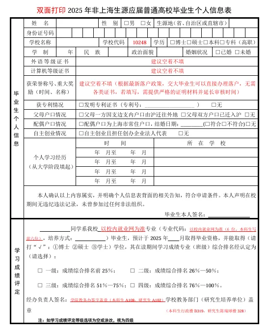 2.附件二:《2025年非上海生源应届普通高校毕业生个人信息表》(即蓝表);需双面打印