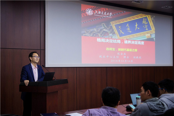 侯士兵以 “格局决定结局,境界决定高度”为主题向同学们作选调生政策解读专题报告。他从国际形势和国内政治体制改革讲起,建议同学们更多地思考其背后的深层原因,提醒同学们重视生涯规划;随后,侯士兵为同学们详细介绍了选调生政策的基本情况、报考流程和近年交大选调生的报考录取情况,重点强调了定向选调、公务员、老员工村官的区别;最后,他鼓励同学们走向祖国最需要人才的中西部地区,为国家和民族的发展做出交大人的贡献。在提问环节中,同学们踊跃参与,侯士兵对报考意向选择、专业限制等问题做出了详细的解答,同学们表示获益匪浅。