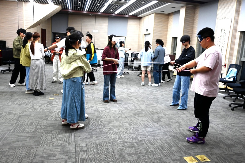 随后的“盲人方阵”协作挑战中,林晓桐通过蒙眼组绳的沉浸式体验,让同学们在黑暗中共启信任之旅。“向左三步”“保持绳子张力”的指令交织中,各小组最终呈现的几何图案不仅展现团队默契,更引发对沟通艺术的深层思考,胡文婷也从专业角度点评了活动的亮点和提升空间。