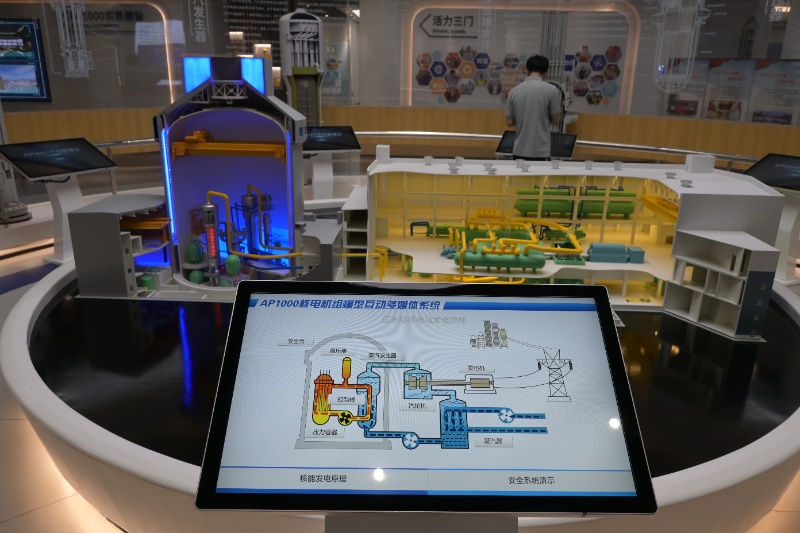实践团首先来到三门核电站展厅,由讲解员详细介绍了三门核电站从规划建设到运营管理的完整发展历程,以及核电站的整体布局、技术特点和运营现状。展厅中陈列着AP1000实景图、新中国第一块铀矿石模型、1:1仿真燃料组件模型、控制棒组件模型等展品,将复杂的核电系统清晰呈现。随后,大家来到“两弹一星”元勋事迹展区,通过珍贵的历史影像和文献资料,回顾了钱学森、邓稼先等老一辈科学家为祖国核事业呕心沥血的奋斗历程。中国核工业从无到有、从弱到强的发展史,让师生们深深感受到了一代代核电工作者不畏艰难、勇于创新的精神力量。