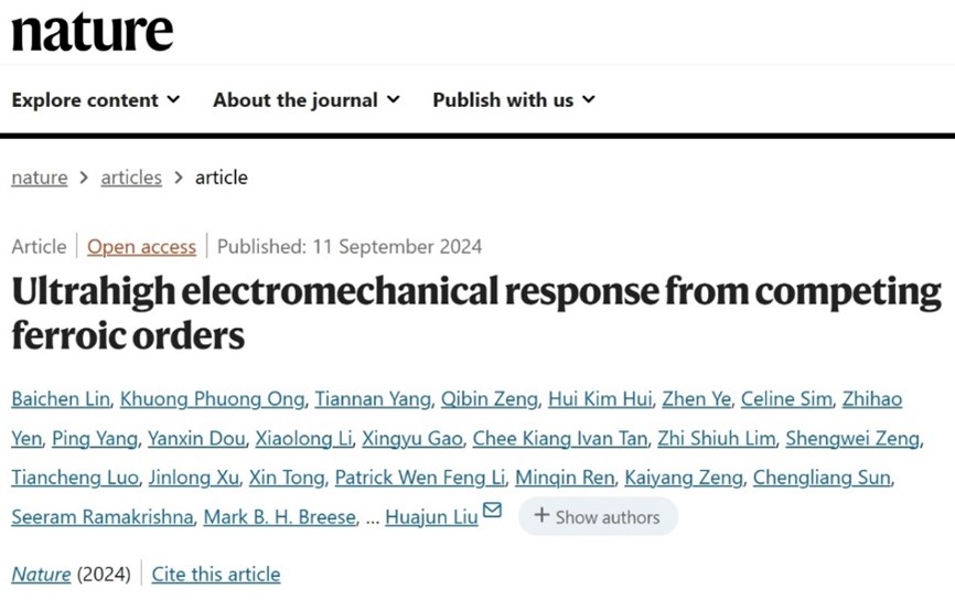 9月11日,伟德国际1946前瞻交叉研究中心杨天南副教授在Nature上发表题为“Ultrahigh electromechanical response from competing ferroic orders”的研究论文,提出了基于极化序构竞争的机电耦合材料设计策略,通过构建反铁电与铁电相共存,增强电场诱导的晶格序构响应,实现材料压电性显著提高。杨天南副教授为共同第一作者,另两位共同第一作者为新加坡科技研究局/新加坡南洋理工大学博士生林柏臣、新加坡科技研究局Khuong Phuong Ong研究员,通讯作者为新加坡南洋理工大学Yeng Ming Lam教授与新加坡科技研究局刘华俊研究员。