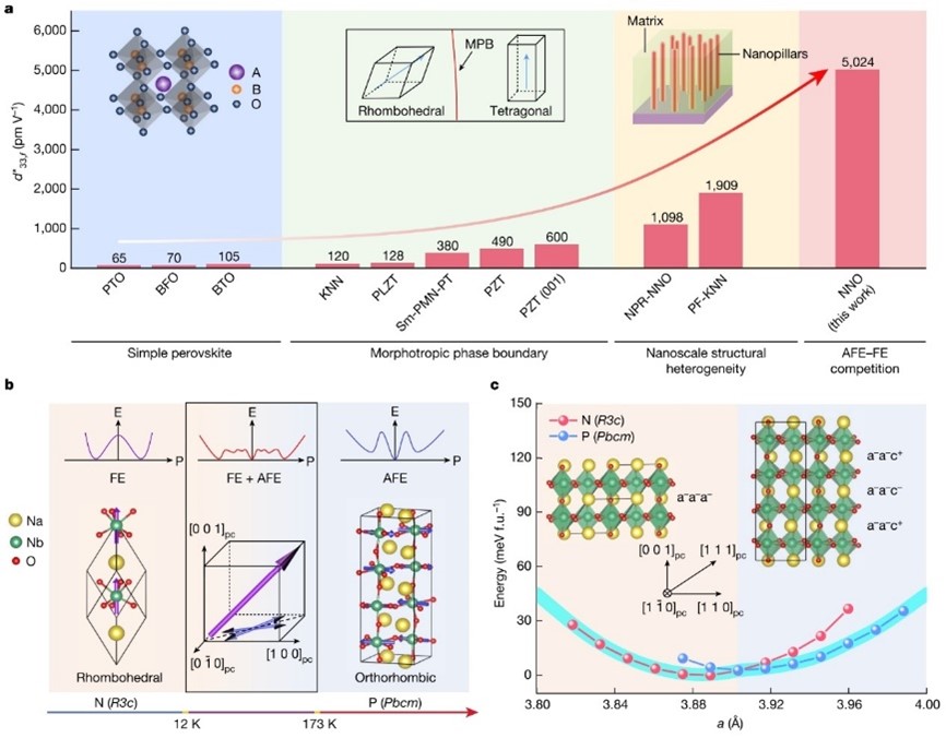 具有机电耦合的物质可以实现机械能和电能的相互转换,是换能器和声学器件应用的关键。铁电材料的极化序构伴随着较强晶格形变,具有较高的电致伸缩系数,可望带来高效的机电响应。通过获得强烈的结构不稳定性,可显著提高铁电材料的机电耦合,其传统方法包括获得准同型相界与构造纳米尺度的结构异质性两种。本研究提出了一种基于反铁电和铁电相竞争的结构不稳定性提高材料机电响应的新策略,为机电器件的材料设计提供了新思路。